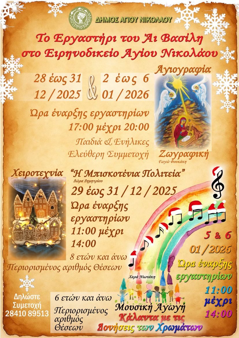 Ο Δήμος Αγίου Νικολάου καλεί μικρούς και μεγάλους να επισκεφθούν την Χριστουγεννιάτικη «Παραμυθοχώρα» και να συμμετέχουν σε ένα κόσμο γεμάτο παραμυθένιες περιπέτειες που ξετυλίγεται φέτος στη Νεάπολη και στον Άγιο Νικόλαο. Το Σάββατο 27 Δεκεμβρίου 2025 στο Δημοτικό Κήπο της Νεάπολης ( Ώρα 16:00 – 20:00) και την Κυριακή 28 Δεκεμβρίου 2025 στην «Πλατεία Μεραμβέλου» -έναντι παλιού Δημαρχείου ( Ώρα :11:00 -15:00). Θα παρουσιαστούν θεαματικά δρώμενα από την ομάδα θεάτρου […]