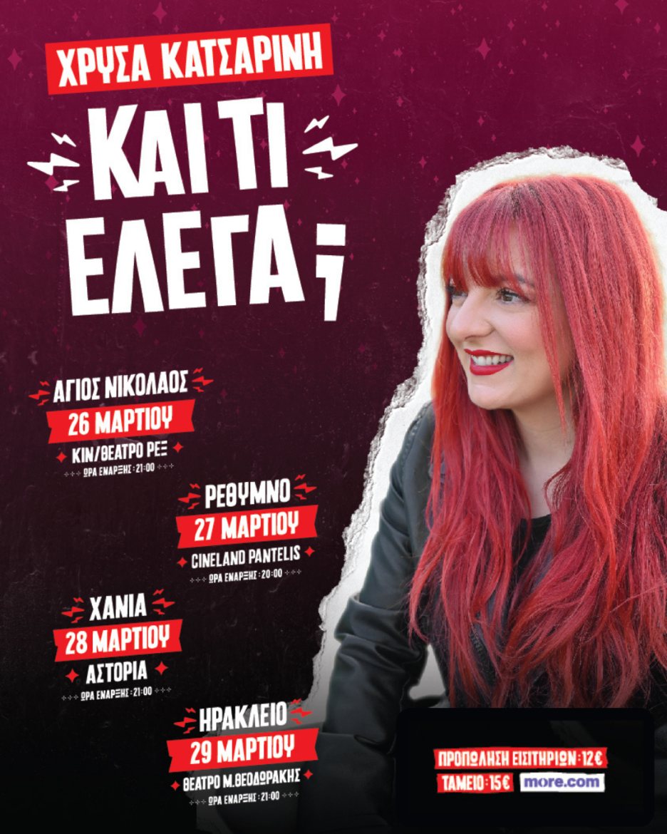 Η Χρύσα Κατσαρίνη παρουσιάζει τη νέα της stand up comedy παράσταση «ΚΑΙ ΤΙ ΕΛΕΓΑ;» στον Άγιο Νικόλαο, την Πέμπτη 26 Μαρτίου 2026 στο κινηματοθέατρο REX . Ολόκληρη η παράσταση αφορά ένα και μόνο βράδυ… αυτό της 6ης Μαΐου του 2012. Ένα καθοριστικό βράδυ. Πρέπει να γνωρίζετε πως η Χρύσα έχει διάσπαση προσοχής και για πρώτη φορά άφησε τη διαταραχή της να πάρει τα ηνία… Οπότε μπορεί και να μη μιλάει […]
