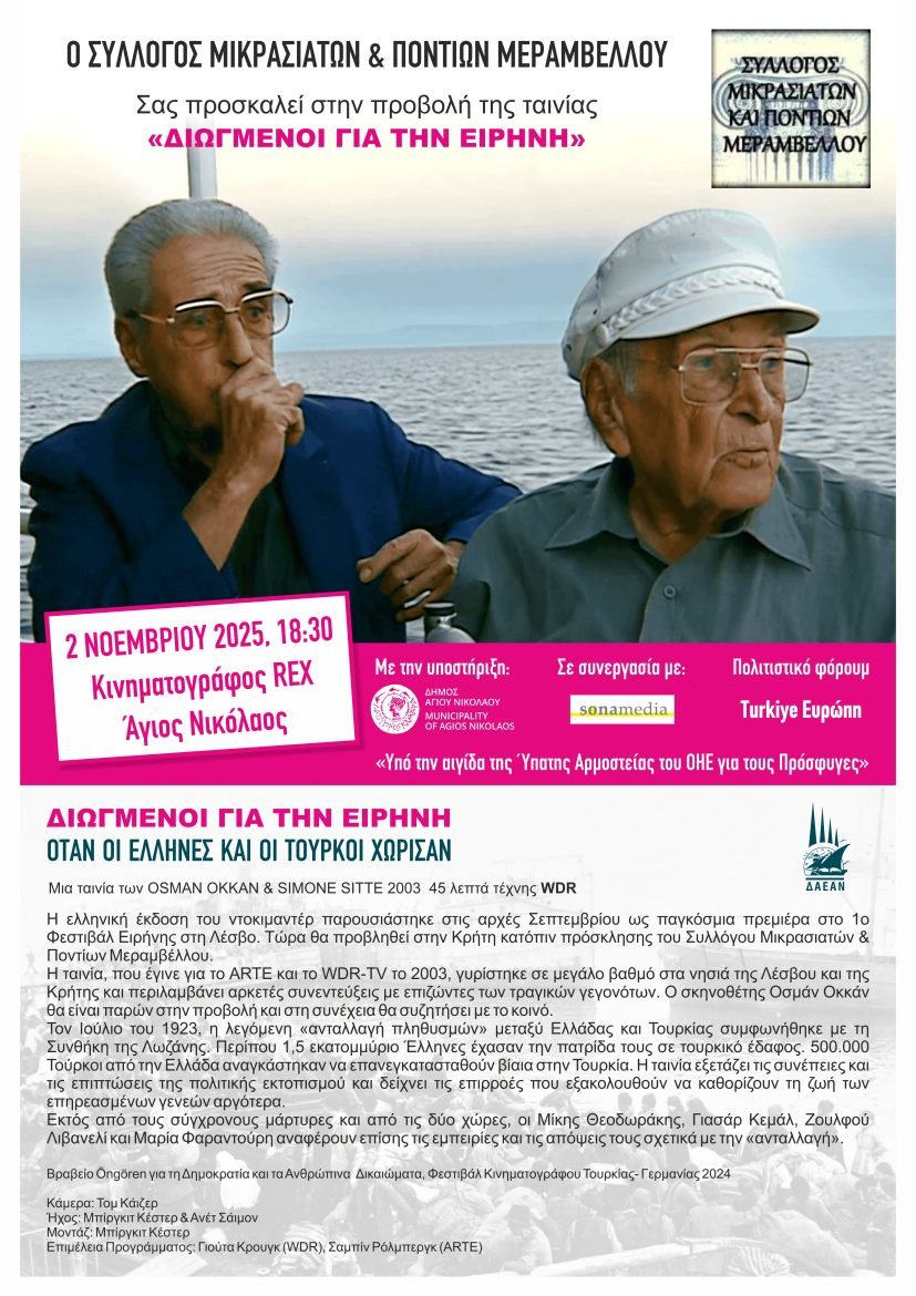 Ο Σύλλογος Μικρασιατών και Ποντίων σας καλεί να παρευρεθείτε στην προβολή της ταινίας «ΔΙΩΓΜΕΝΟΙ ΓΙΑ ΤΗΝ ΕΙΡΗΝΗ», Κυριακή 2 Νοεμβρίου στον κινηματογράφο REX στον Άγιο Νικόλαο. Η προβολή της ταινίας αποτελεί εκδήλωση μνήμης, για τον βίαιο ξεριζωμό Ελλήνων και Τούρκων (1923) από τις εστίες τους. Ώρα : 18:30 Είσοδος Ελεύθερη Η εκδήλωση πραγματοποιείται με την υποστήριξη του Δήμου Αγίου Νικολάου (Δ.Α.Ε.Α.Ν) της sonamedia και του Πολιτιστικού Φόρουμ Turkiye Ευρώπη. Υπό […]