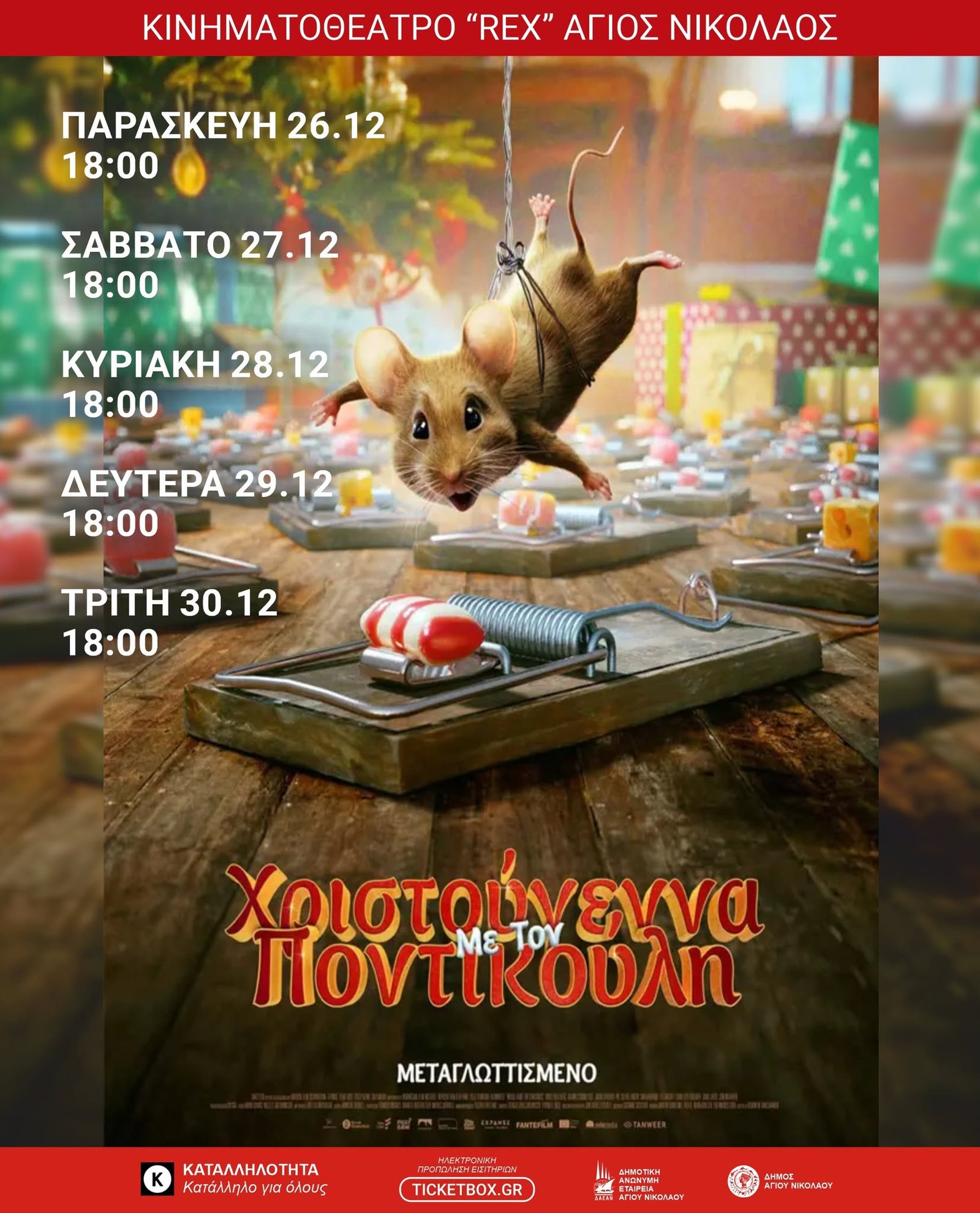 Με τις ταινίες “Χριστούγεννα με τον Ποντικούλη”, “Avatar: Φωτιά και Στάχτη”, “Βερμίλιο: Η Νύφη του Βουνού (Vermiglio)” και “Wicked: For Good”, συνεχίζονται οι προβολές στα Κινηματοθέατρα «REX» στον Άγιο Νικόλαο και «Δρήρος» στη Νεάπολη.
