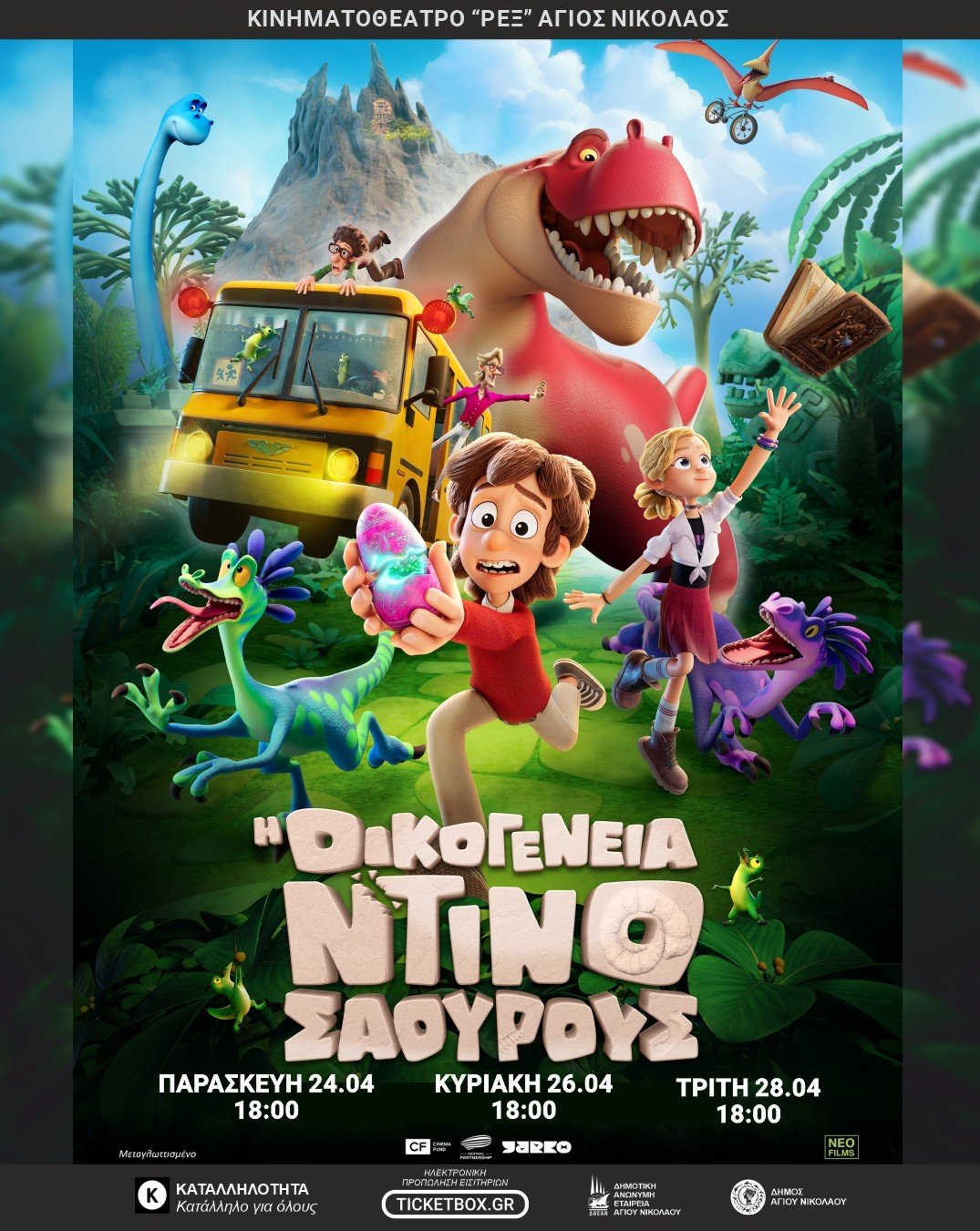 Με τις ταινίες «Οικογένεια Ντινοσάουρους», «Δυστυχώς Βρίζω», «I Was a Stranger» και «Solo Mio» συνεχίζονται οι προβολές στα κινηματοθέατρα «REX» του Αγίου Νικολάου και «Δρήρος» της Νεάπολης.