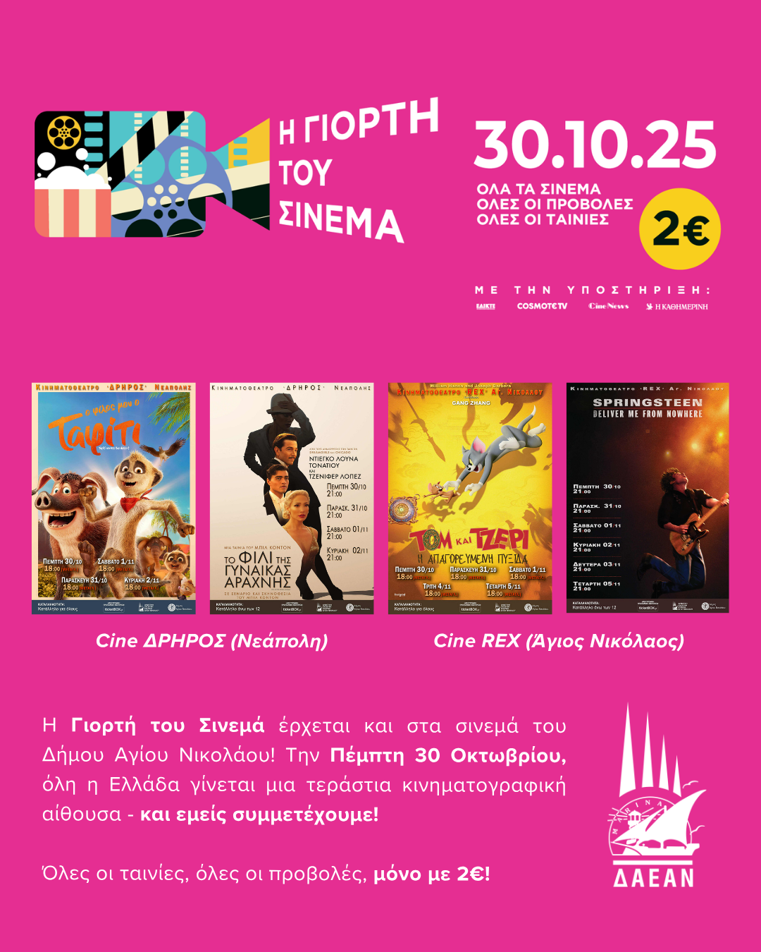 Στο Κινηματοθέατρο REX στον Άγιο Νικόλαο και στο Κινηματοθέατρο “ΔΡΗΡΟΣ” στη Νεάπολη, όλες οι ταινίες και όλες οι προβολές θα είναι την συγκεκριμένη ημέρα διαθέσιμες μόνο με 2€!