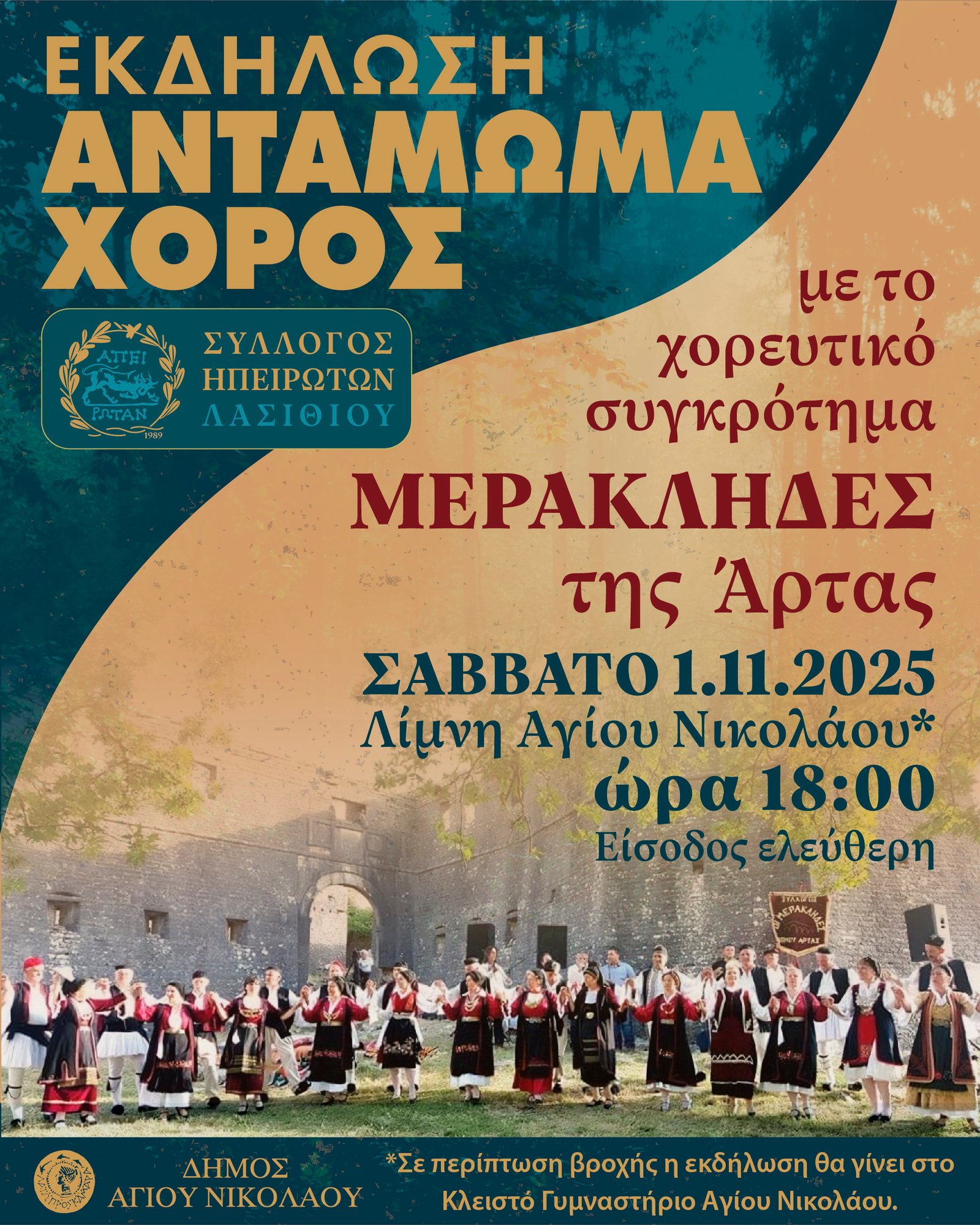 Ο Σύλλογος Ηπειρωτών Λασιθίου σε συνεργασία με το Δήμο Αγίου Νικολάου διοργανώνουν την εκδήλωση : «Αντάμωμα – Χορός» το Σάββατο 1 Νοεμβρίου 2025 στη Λίμνη Αγίου Νικολάου.