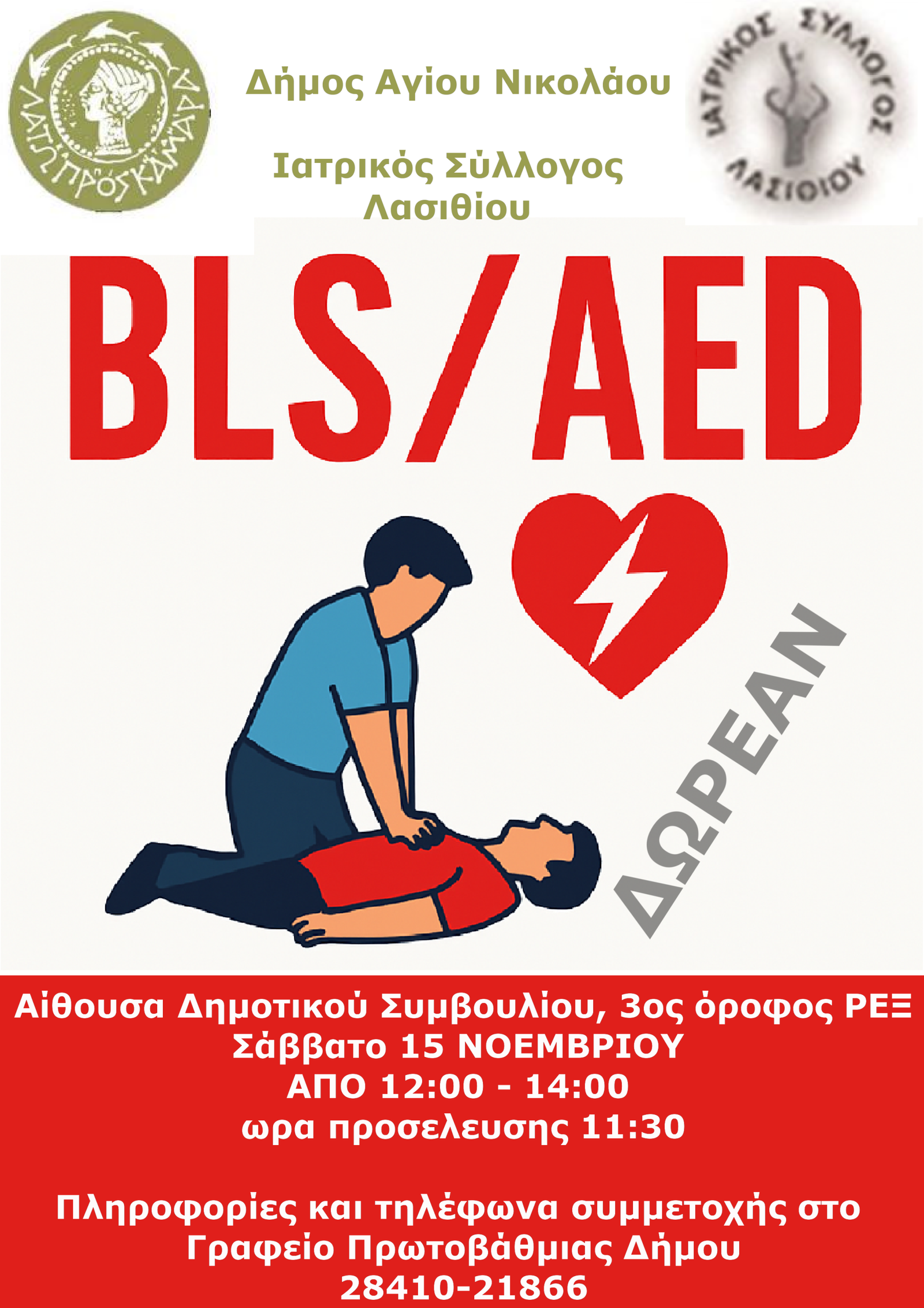 Το Γραφείο Πρωτοβάθμιας Υγείας, του Τμήματος Κοινωνικής Προστασίας & Παιδείας Δήμου Αγίου Νικολάου σε συνεργασία με τον Ιατρικό Σύλλογο Λασιθίου στο πλαίσιο των δράσεων προαγωγής της υγείας και ενίσχυσης της ετοιμότητας των πολιτών σε καταστάσεις επείγουσας ανάγκης ενημερώνει, ότι θα πραγματοποιηθούν εκπαιδευτικά σεμινάρια για Καρδιοπνευμονική Αναζωογόνηση (ΚΑΡΠΑ), για την χρήση Αυτόματου Εξωτερικού Απινιδωτή (AED), την αντιμετώπιση Πνιγμονής από ξένο σώμα και τη θέση Ανάνηψη για ενήλικες και παιδιά.
