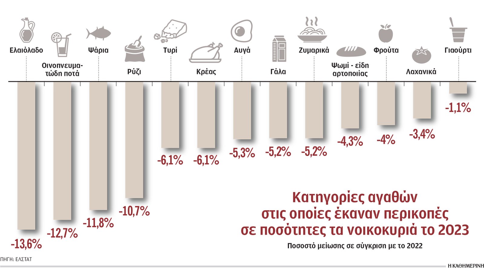 Ακόμη πιο ορατές είναι οι επιπτώσεις της οικονομικής κρίσης της προηγούμενης δεκαετίας, καθώς και της πληθωριστικής κρίσης της τελευταίας τριετίας στις καθημερινές μας διατροφικές συνήθειες. Η Ερευνα Οικογενειακών Προϋπολογισμών της ΕΛΣΤΑΤ για το 2023 αποκάλυψε ότι τα νοικοκυριά έβαλαν «μαχαίρι» στην κατανάλωση βασικών ειδών διατροφής την περυσινή χρονιά, αγοράζοντας λιγότερες ποσότητες από αυτά, προκειμένου να μπορέσουν να καλύψουν άλλες βασικές ανάγκες. Αυτό, βεβαίως, δεν σημαίνει ότι πλήρωσαν λιγότερα χρήματα, καθώς η μέση μηνιαία δαπάνη για σχεδόν τα ίδια είδη αυξήθηκε. Η μέση μηνιαία κατανάλωση (σε ποσότητες) υποχώρησε το 2023 κατά 13,6% όσον αφορά το ελαιόλαδο, κατά 12,7% στα οινοπνευματώδη ποτά, κατά 11,8% στα ψάρια. Επίσης, καταναλώσαμε κατά 10,7% λιγότερο ρύζι, κατά 6,1% λιγότερο κρέας, κατά 5,3% λιγότερα αυγά και κατά 5,2% λιγότερο γάλα και ζυμαρικά. Περικοπές κάναμε ακόμη και στο ψωμί (-4,3%), στα φρούτα και στα λαχανικά (-4% και -3,4%, αντιστοίχως). Από την άλλη, η μέση μηνιαία δαπάνη αυξήθηκε κατά 11,9% για το ελαιόλαδο, κατά 7,2% για τα φρούτα, κατά 6,6% για τα λαχανικά, κατά 3,3% για το κρέας, κατά 6,6% για γαλακτοκομικά και αυγά, κάτι που οφείλεται στις ανατιμήσεις. Οι αλλαγές στις καθημερινές διατροφικές συνήθειες είναι στην πραγματικότητα πολύ βαθύτερες και συντελέστηκαν σε μεγάλο βαθμό στη διάρκεια της προηγούμενης δεκαετίας. Η κατανάλωση μοσχαρίσιου κρέατος ήταν χαμηλότερη το 2023 σε σύγκριση με το 2009 κατά 34%, ψαριών κατά 32%, αιγοπρόβειου κρέατος κατά 20%, ελαιολάδου κατά 35%, φρούτων κατά 11%. Από την άλλη, το ότι οι Ελληνες «ανακάλυψαν» ξανά τα όσπρια –μεγαλύτερη κατά 21% η κατανάλωση το 2023 σε σύγκριση με το 2009– συνδέεται μάλλον με την τσέπη τους και λιγότερο με την παγκόσμια τάση για κατανάλωση φυτικών πρωτεϊνών αντί των ζωικών.