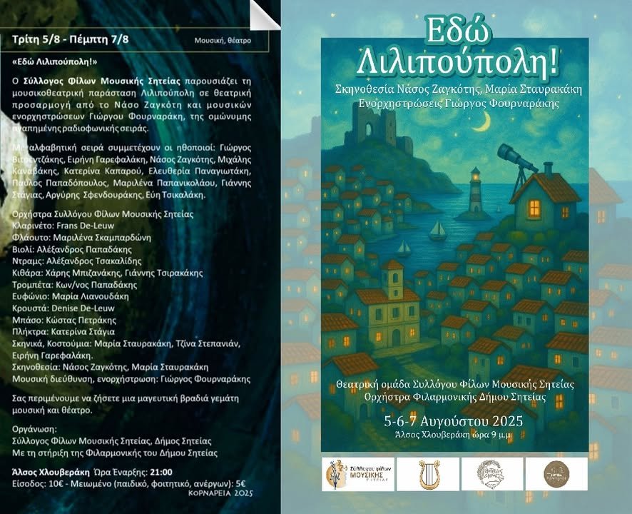 Η θεατρική ομάδα του “Συλλόγου Φίλων Μουσικής Σητείας” παρουσιάζει τη μουσικοθεατρική παράσταση “Εδώ Λιλιπούπολη!” 5,6 & 7 Αυγούστου στις 21:00 στο Άλσος Χλουβεράκη.