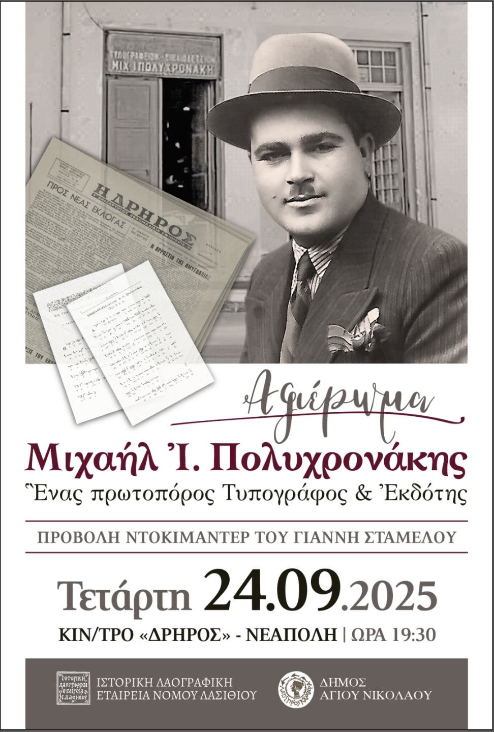 Η Ιστορική Λαογραφική Εταιρεία Νομού Λασιθίου σε συνεργασία με τον Δήμο Αγίου Νικολάου διοργανώνουν εκδήλωση-αφιέρωμα στον Μιχαήλ Ιωάννου Πολυχρονάκη την Τετάρτη 24 Σεπτεμβρίου 2025 στο κινηματοθέατρο «Δρήρος» στη Νεάπολη, κατά τη διάρκεια της οποίας θα προβληθεί το ντοκιμαντέρ του Γιάννη Σταμέλου που είναι αφιερωμένο στον τιμώμενο.