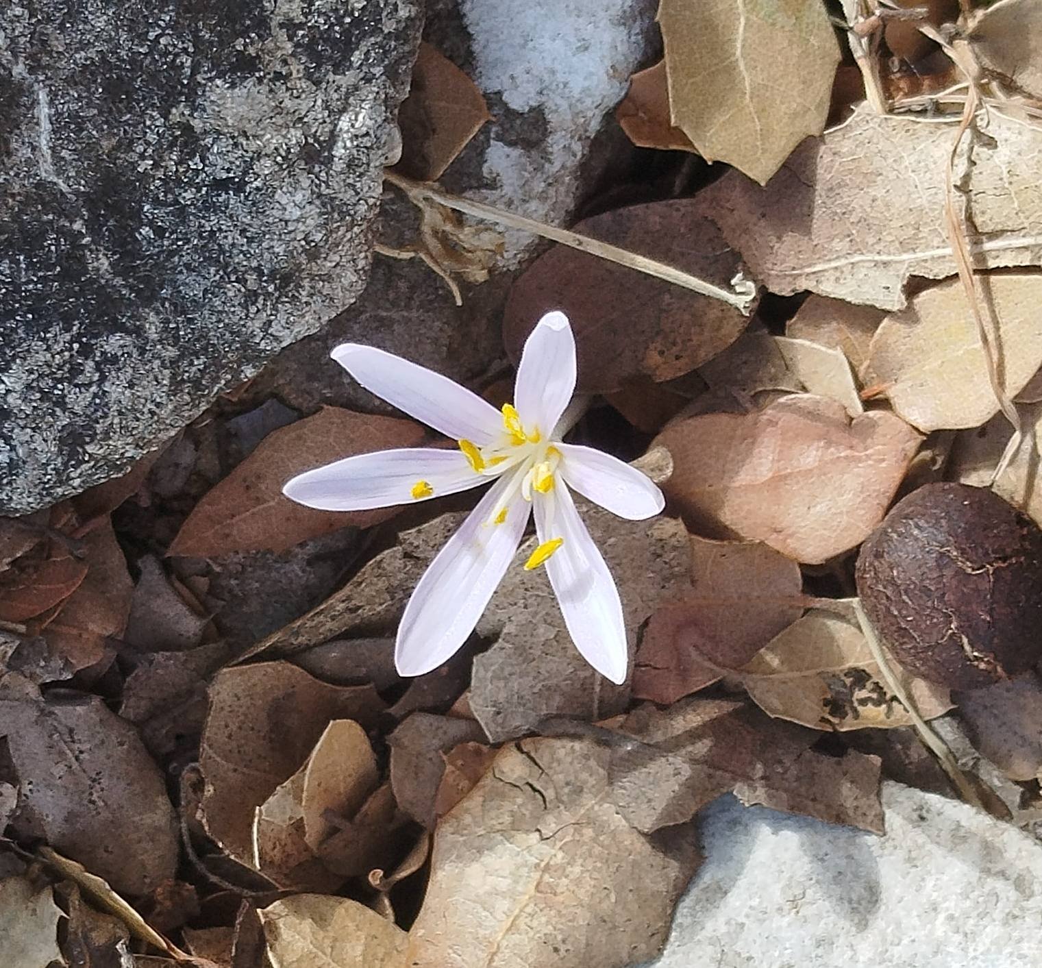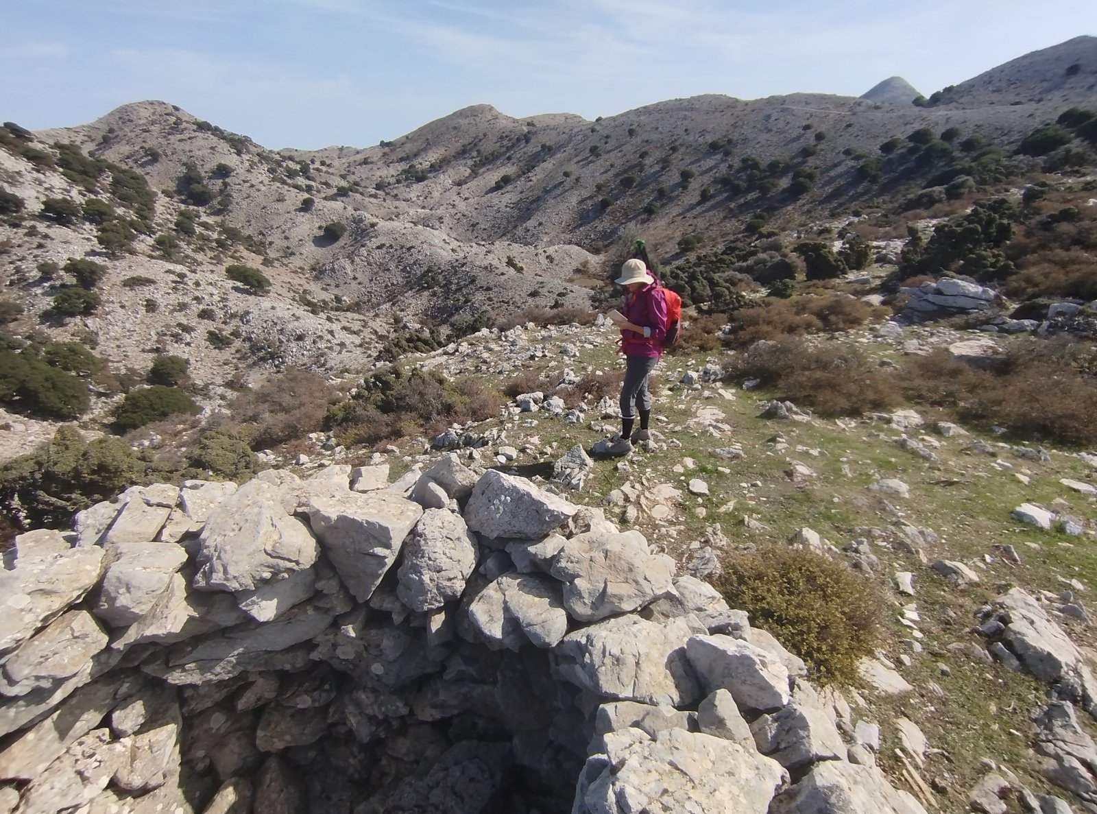 Η κυρίως πορεία ωστόσο γίνεται σε τοπίο γκρι, σκληρό και στιβαρό, όπως κι η ζωή των κτηνοτρόφων ή των ανταρτών που κάποτε έβρισκαν καταφύγιο σε αυτά τα όλο πέτρα άγρια κι αφιλόξενα μέρη. Κάπου – κάπου λίγα πρίνα μοναχικά, κάποια υπολείμματα ξεχασμένων μαντριών, όρνια που ζυγιάζονται πάνω απ’ τα κεφάλια μας, μικρά φθινοπωρινά λουλουδάκια ανάμεσα στις πέτρες. Κουραστική ανηφόρα εκτός μονοπατιού, που σε κάνει να αδημονείς να φτάσεις ψηλά. Έξι κορφές σύνολο σήμερα: η πρώτη ανώνυμη, η Πλακοκεφάλα, του Φονιά το κεφάλι, η Χιονίστρα, η Κολόκυθα και τέλος του Φονιά ο δέτης, όλες πετρώδεις και καθεμιά ξεχωριστή λόγω της θέσης της. Κάναμε δηλαδή μια διάσχιση της οροσειράς της Σελένας παρακάμπτοντας ωστόσο την πιο ψηλή ομώνυμη κορφή της. Στα ίδια μέρη περπάτησε κι ομάδα του Πεζοπορικού Ηρακλείου σήμερα ξεκινώντας από πιο ψηλά και τερματίζοντας στα Ζένια.