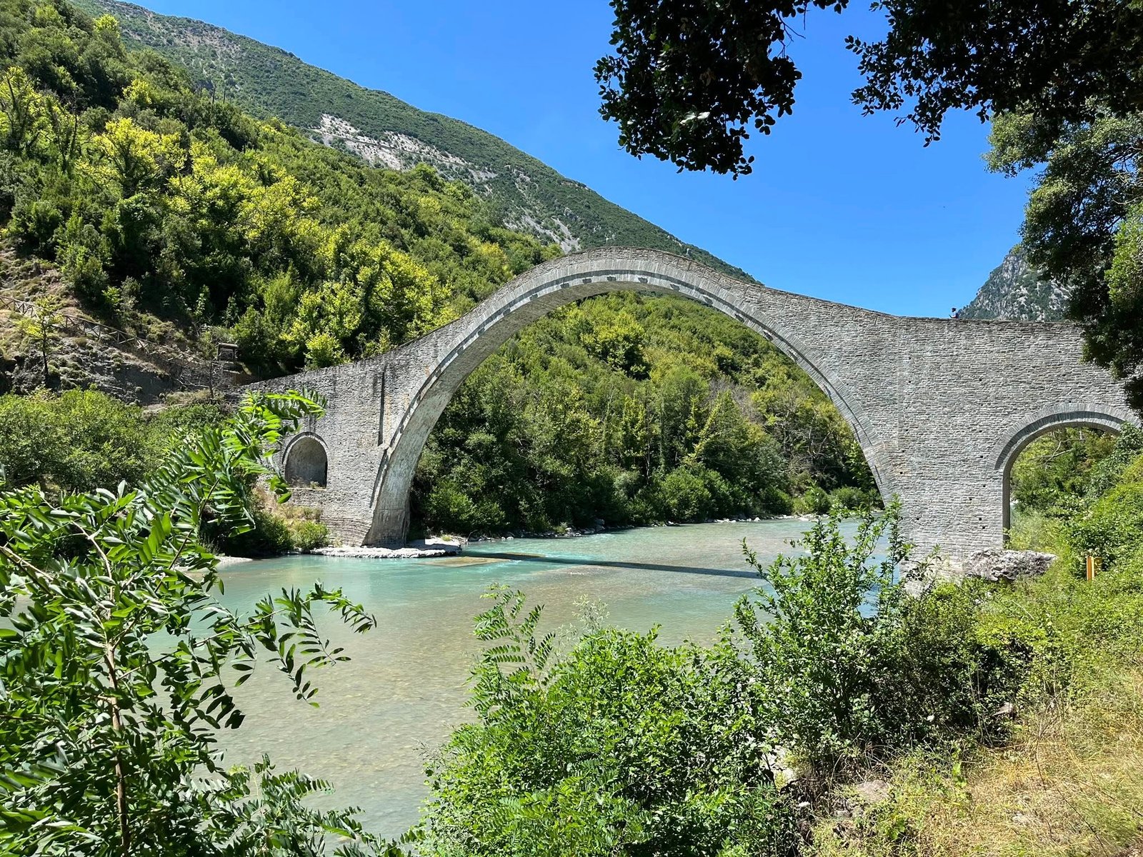 Έπειτα θα επισκεφτούμε το περίφημο γεφύρι της Πλάκας, το μεγαλύτερο μονότοξο  των Βαλκανίων, που ολοκληρώθηκε το 1866 με πρωτομάστορα τον Κώστα Μπέκα απ’ τα Πράμαντα κατά την τρίτη προσπάθεια ανέγερσης (οι δυο πρώτες αποτυχημένες). Μάλιστα ο θρύλος θέλει να χρησιμοποιείται κονίαμα από χιλιάδες αβγά για τη στήριξή του!!! Όλα αυτά δείχνουν τη σημασία του! Ως το 1913 αποτέλεσε και το πέρασμα από την ελεύθερη νότια Ελλάδα στην οθωμανική βόρεια! Τέλος κατέρρευσε μέρος του το 2015 λόγω υπερχείλισης του ποταμού, αλλά αναστηλώθηκε ως το 2019 από το Εθνικό Μετσόβιο Πολυτεχνείο. Έτσι σήμερα είναι ακόμα εκεί, για να το θαυμάζουμε!
