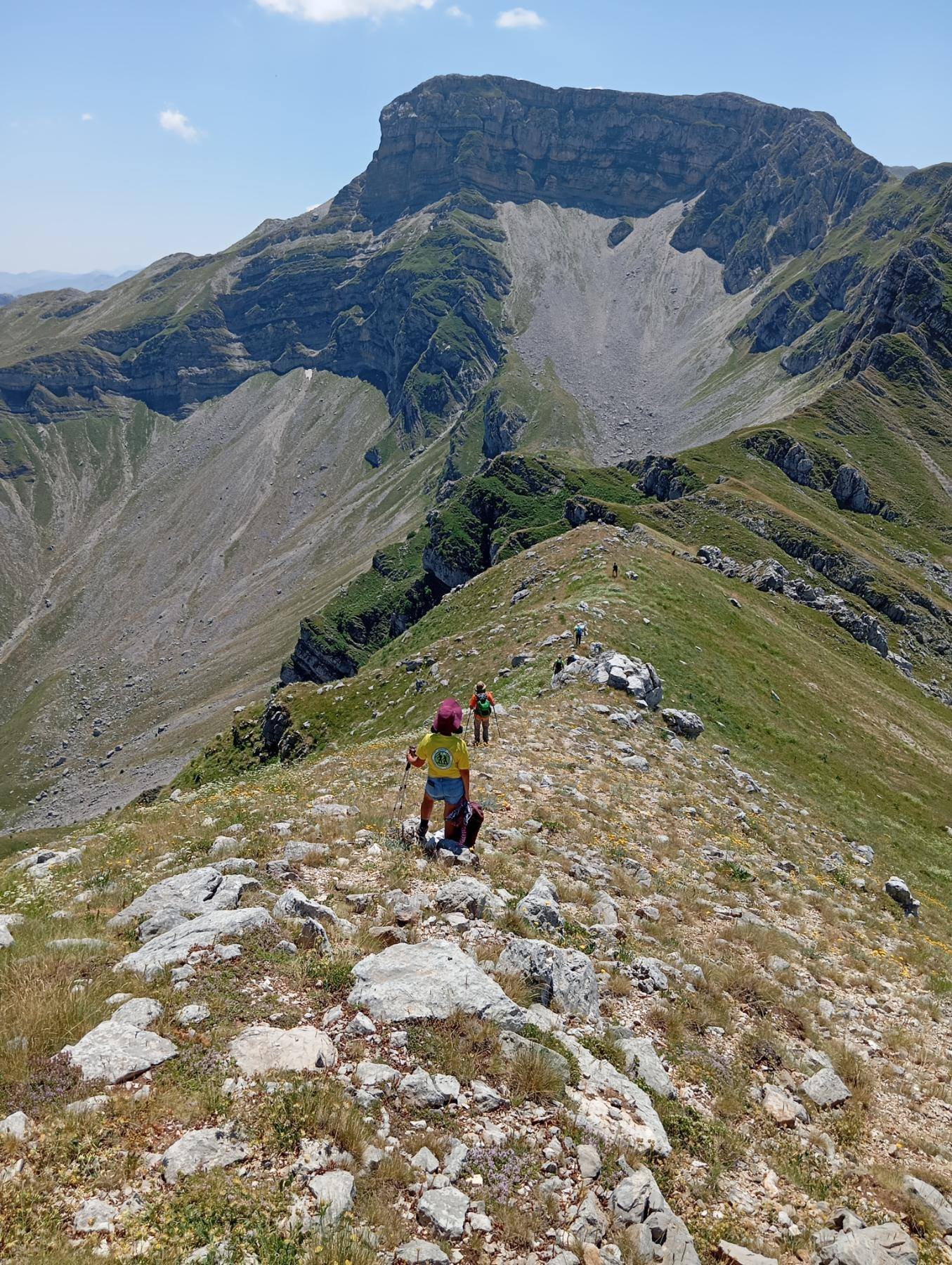 των Αθαμανικών Ορέων κι ούτε καν η ψηλότερη κορφή τους (είναι η Κακαρδίτσα στα 2429!). Είναι ωστόσο η πιο δημοφιλής λόγω της θέας και της όμορφης φύσης της. Αποβραδίς μας τρόμαξε με τον όγκο της να υψώνεται πάνω απ’ το ξενοδοχείο κι έκανε αρκετούς να το ξανασκεφτούν. Ωστόσο νωρίς το πρωί της Τρίτης 12 ορειβάτες απ’ την παρέα ξεκινάμε από το ορειβατικό καταφύγιο των Πραμάντων υπό την καθοδήγηση του Λάκη και του Γιώργου απ’ τους Μελισσουργούς. Η μέθοδος των τριών του Λάκη είναι το μότο μας: «3 ώρες ανάβαση, τρεις ώρες διάσχιση, τρεις ώρες κατάβαση». Χρονοδιάγραμμα που ακολουθήσαμε πιστά κόβοντας ενίοτε απ’ τις στάσεις μας.