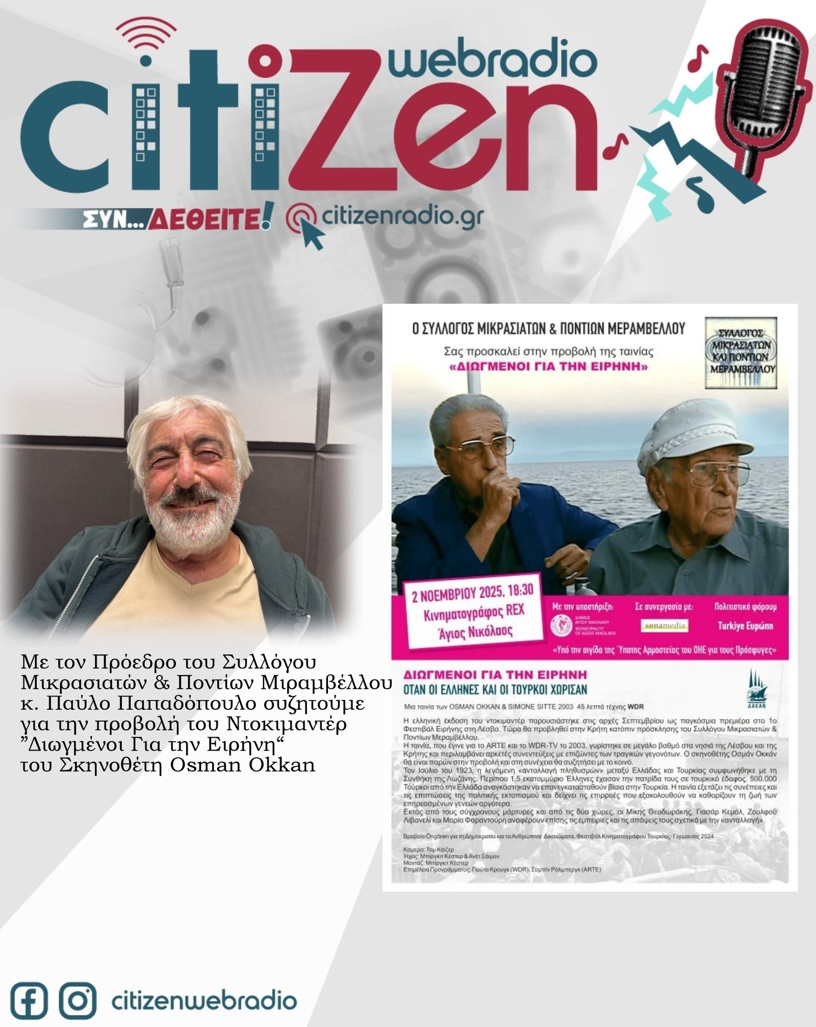 Μιλάμε για την προβολή του ντοκιμαντέρ ΔΙΩΓΜΕΝΟΙ ΓΙΑ ΤΗΝ ΕΙΡΗΝΗ του Σκηνοθέτη Osman Okkan, την Κυριακή 2 Νοεμβρίου στο κινηματοθέατρο REX στις 18:30.
