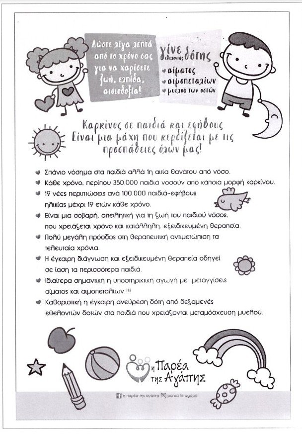 Έχει διασφαλιστεί η νομική υπόσταση του σωματείου μας το οποίο δραστηριοποιείται στο χώρο της Κλινικής Αιματολογίας -Ογκολογίας Παίδων του Πα.Γ.Ν.Η για την ψυχαγωγία των παιδιών, την ψυχολογική τους υποστήριξη από ψυχολόγο τον οποίον επιχορηγούμε με απόφαση του ΔΣ του ΠαΓΝΗ αλλά και κάλυψη του κόστους ιατρικών εξετάσεων που δεν καλύπτονται από τον ΕΟΠΠΥ. Οργανώνουμε επίσης σε συνεργασία με τη Μονάδα Αιμοδοσίας του ΠαΓΝΗ εθελοντικές αιμοδοσίες, εκστρατείες ενημέρωσης για εθελοντές δότες μυελού των οστών και εθελοντές δότες αιμοπεταλίων.