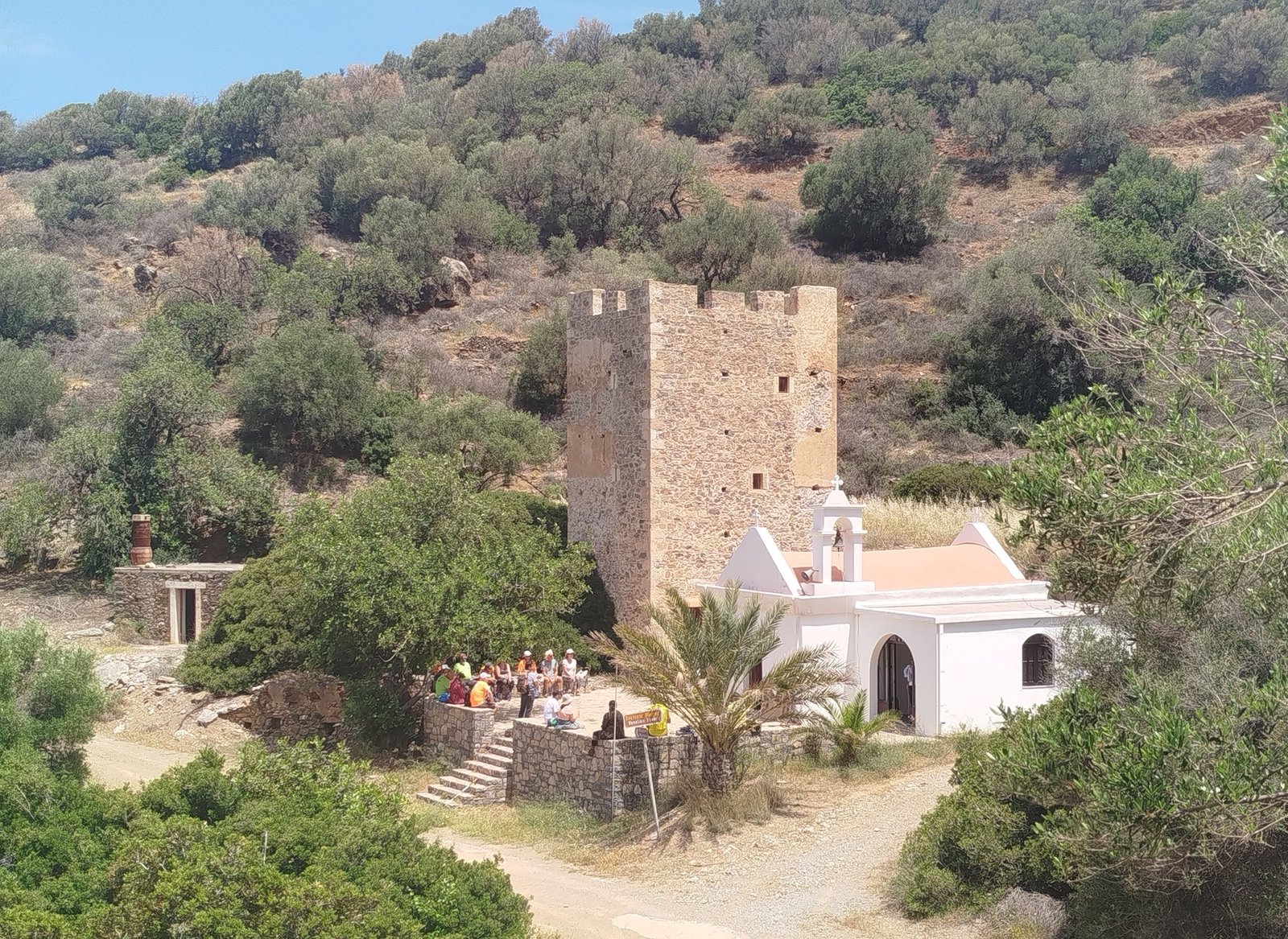 Ανηφορίζοντας θα ενωθούμε με την υπόλοιπη ομάδα και θα κονέψουμε όλοι μαζί στον περίβολο του Αγίου Αντωνίου με τον περίφημο Πύργο των Κορνάρων. Ενώ εμείς δροσιζόμαστε κάτω απ’ τη μεγάλη χαρουπιά, η Μαριάννα θα μας αφηγηθεί την πλούσια ιστορία του χώρου. Πως ήταν γνωστό το μέρος από παλιά κι είχε μικρό οικισμό-μετόχι γιατί ανάβλυζε μια πηγή εκεί κοντά. Πως ο πύργος είναι της Ενετοκρατίας και πιθανόν ανήκε σε ευγενή οικογένεια Ενετών (πυργόσπιτο). Πως το όνομα «των Κορνάρων» το πήρε από μια επιγραφή-χάραγμα που σώζεται σήμερα στο εσωτερικό του ναού με το όνομα του Βιτσέντζου Κορνάρου, ωστόσο αναγράφει 1677, όταν ο ποιητής του Ερωτόκριτου είχε ήδη πεθάνει, άρα πρόκειται για συνωνυμία. Λίγο πιο πάνω σώζεται θαμμένη μέσα στα σκίνα τη «βάρδια» του πύργου, δηλαδή το μέρος, όπου φύλαγαν σκοπιά για εχθρούς απ’ το πέλαγος.