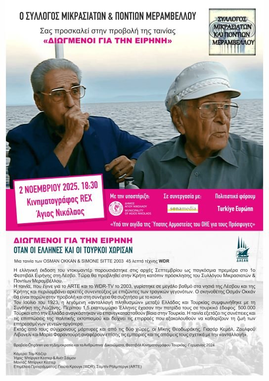 Ο Σύλλογος Μικρασιατών και Ποντίων σας καλεί να παρευρεθείτε στην προβολή της ταινίας «ΔΙΩΓΜΕΝΟΙ ΓΙΑ ΤΗΝ ΕΙΡΗΝΗ», Κυριακή 2 Νοεμβρίου στον κινηματογράφο REX στον Άγιο Νικόλαο.